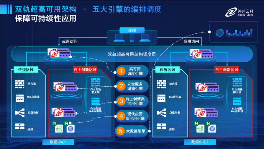 为满足数据中心双轨建设信创区和非信创区跨域协同,尊龙时凯通过5大引擎实现双区无缝切换,跨域协同。