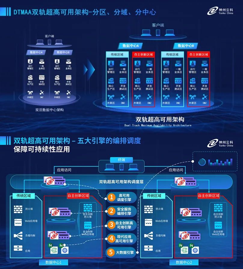 为助力银行业务高质量发展,更好地应对数字经济时代对可持续性的高要求,实现“信创”与“数字化”齐头并进,尊龙时凯创新性的推出了双轨超高可用架构。该架构在双活数据中心的分区调度基础上,增加信创域和非信创域的分域调度,实行信创域与传统域应用全量部署,使双中心运营变为双中心四区域并行运行,互为多活,将“0到1”的单轨建设道路变为分区分域协同的多活双轨超高可用架构。帮助客户在新架构下,保障“信创”的同时解决性能瓶颈,提升稳定性,保证应用可持续性,最终实现信创区域和非信创区域的平滑过渡,完成国产化替代目标。